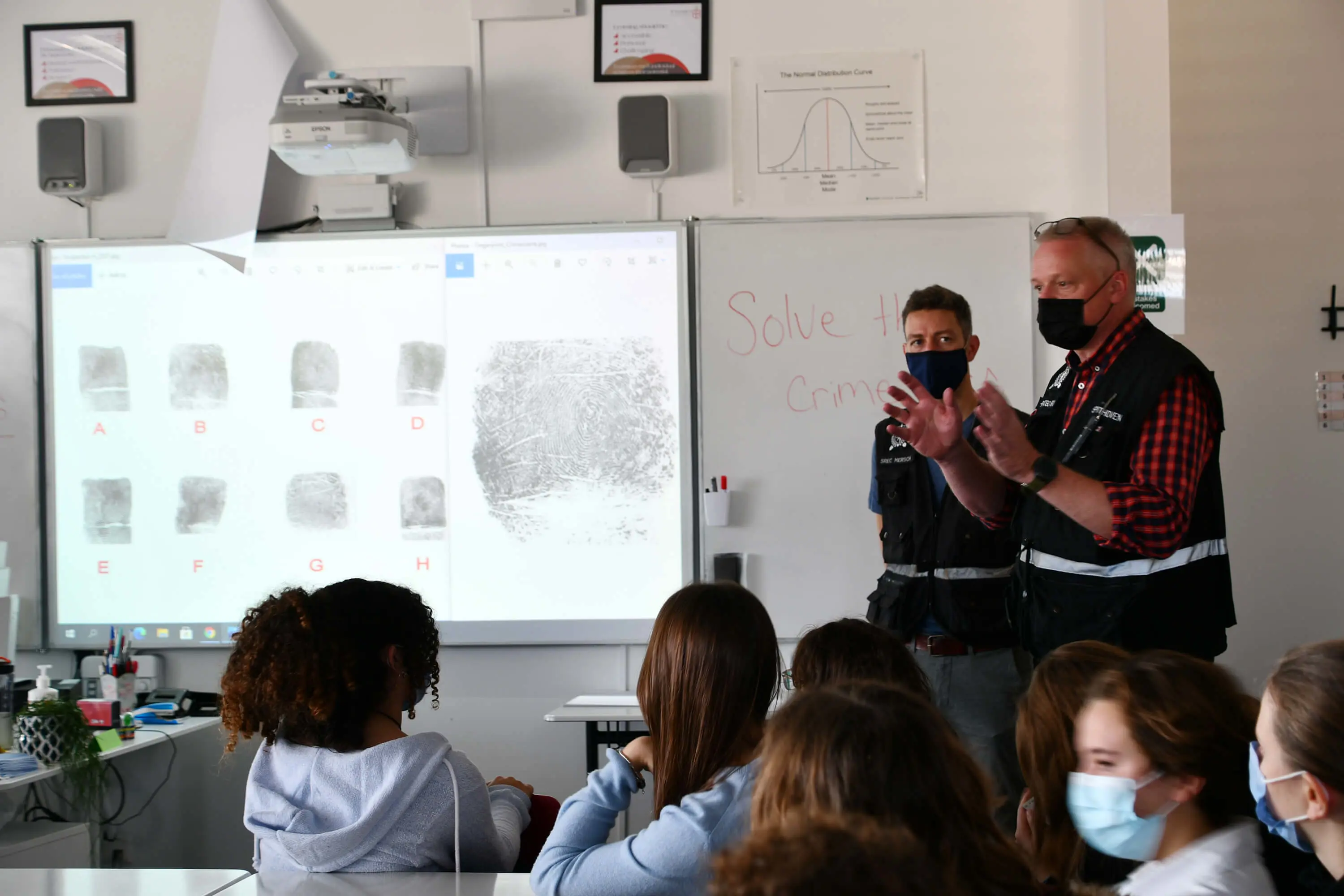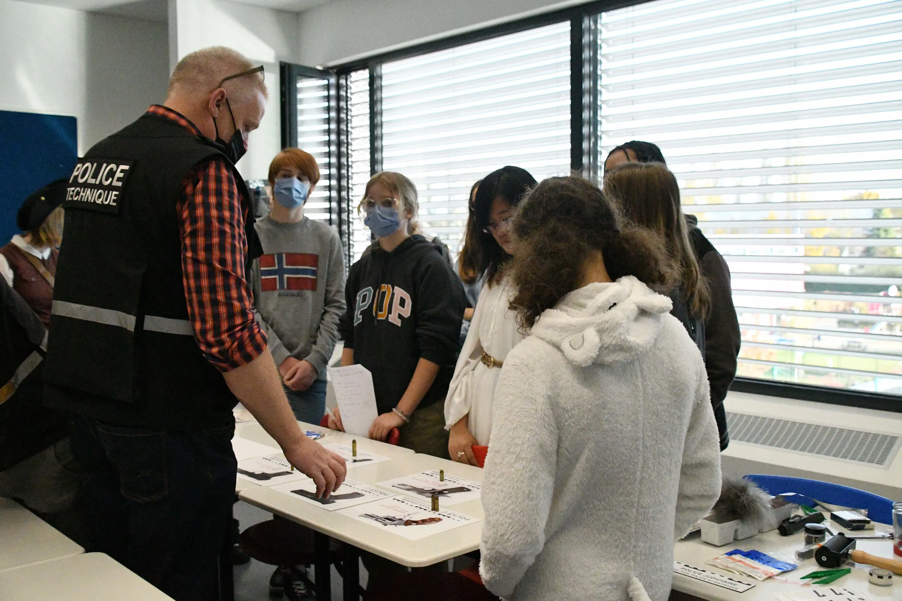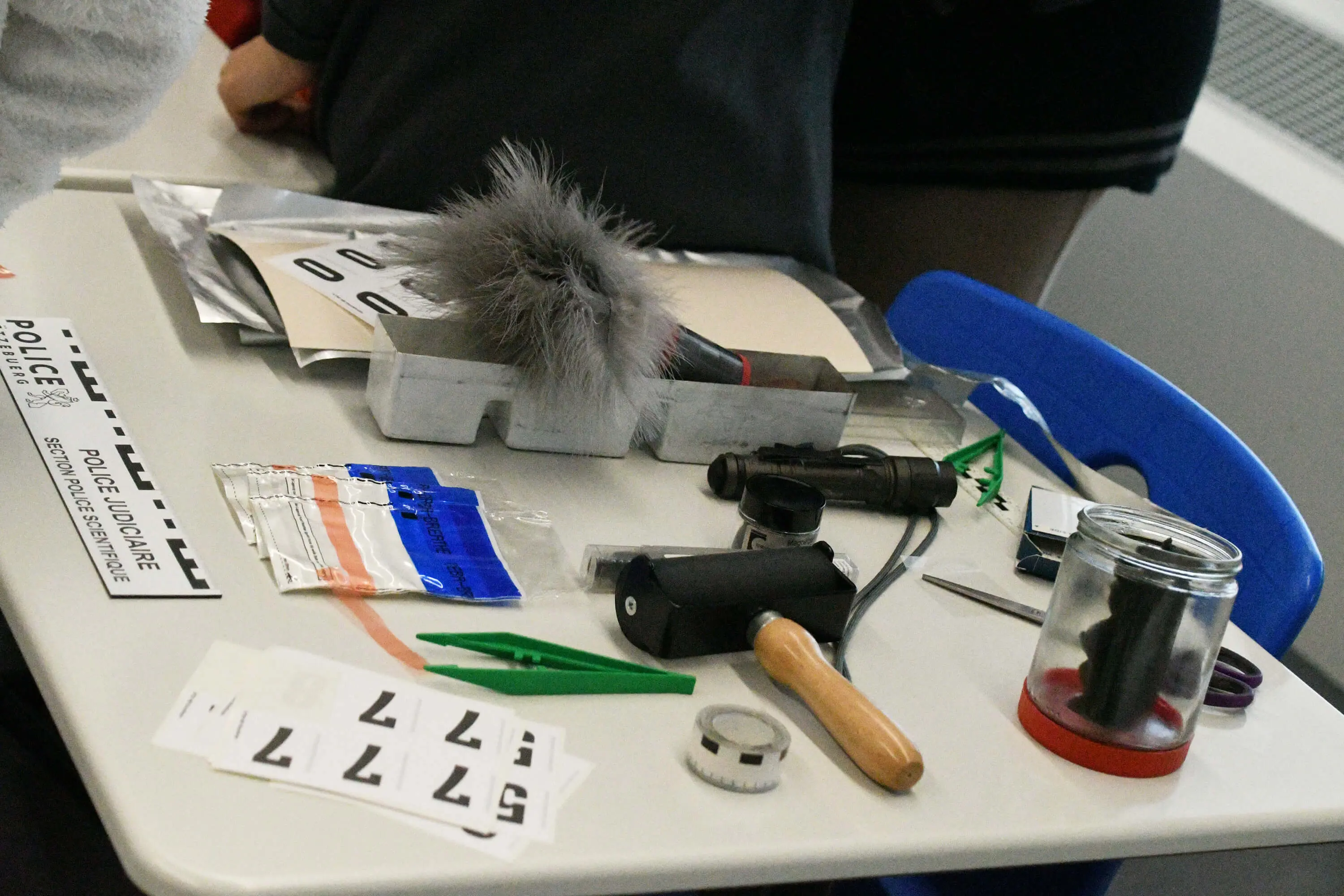 After being shown how to use dust for tracing and other forensic methods, the students studied shoe and fingerprints, and assessed bullet shells to find the perpetrator.