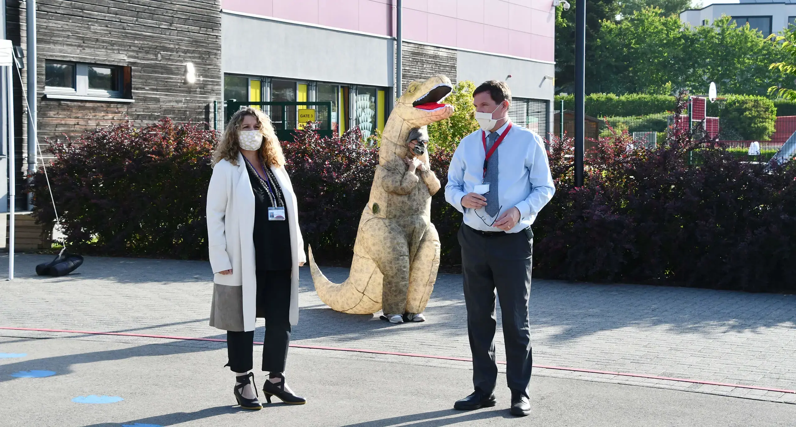 The students were welcomed at the School gates by Mrs T-Rex, their favourite Friendly dinosaur, together with the School’s Principal, Dr Barkei and The Head of Primary, Ms Nuttall. Upon entering the school grounds, the students were directed to their designated entrance where they washed their hands before arriving at their temperature checking station. Each students’ temperature was checked promptly before they were directed to their new classrooms.