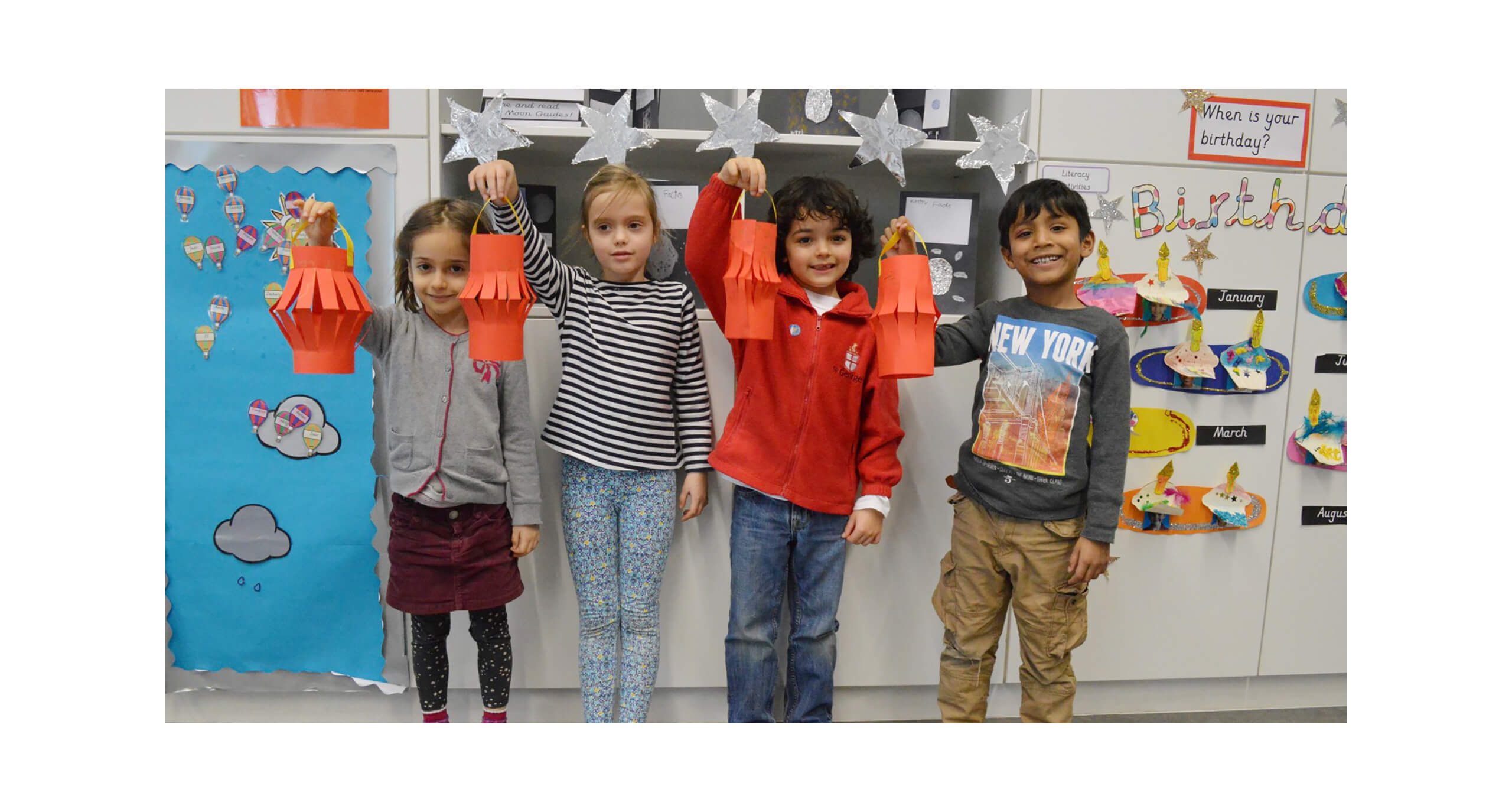 As part of investigating light, 1P students were busy learning about light sources used during a variety of light festivals. The class was split up into three groups, one group creating Chinese Full Moon Lanterns, another learning about the celebration of Diwali and creating Diwali Diyas, (a small lamp made out of clay) and the final group were making a Maypole, a midsummer Pole for the Scandinavian midsummer celebrations. Mrs Munari, from the board of Governors very kindly took the time to help the students create this traditional pole around which a maypole dance often occurs.