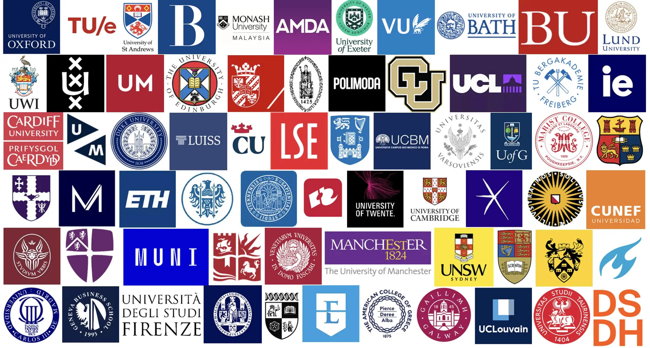 These include institutions such as Maastricht University, Twente University and Eindhoven University of Technology in the Netherlands; University Carlos III of Madrid, CUNEF Universidad and IE University in Spain; University of St Andrews and University of Edinburgh in Scotland; as well as Exeter University, University of Manchester, University of Warwick, University of York and University of Bristol in the UK.