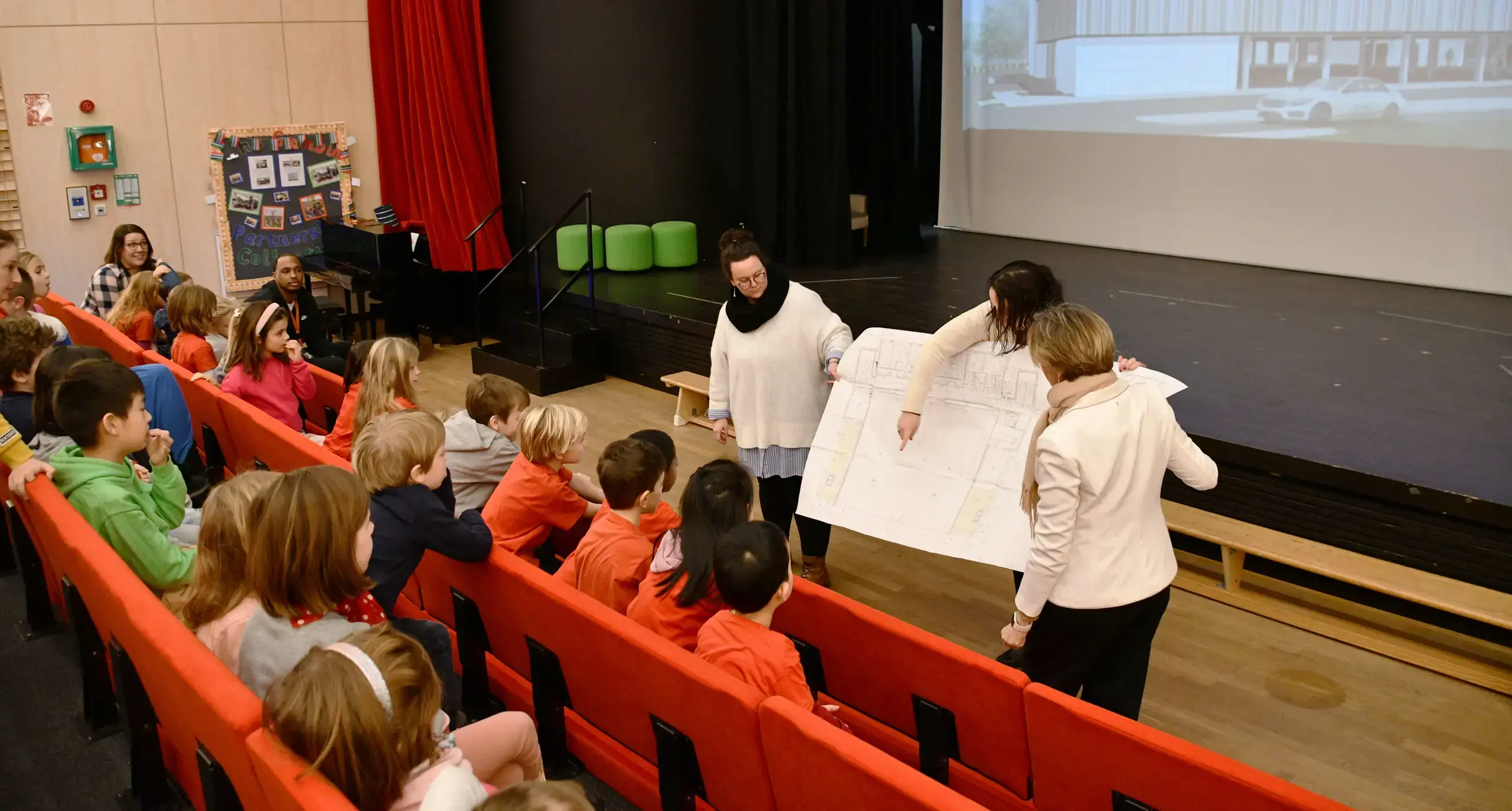 Year 2 classes learnt about the construction of the school's new gymnasium during a talk on Monday afternoon with the project's architect, civil engineer and St George's finance manager, Madame Kruten.